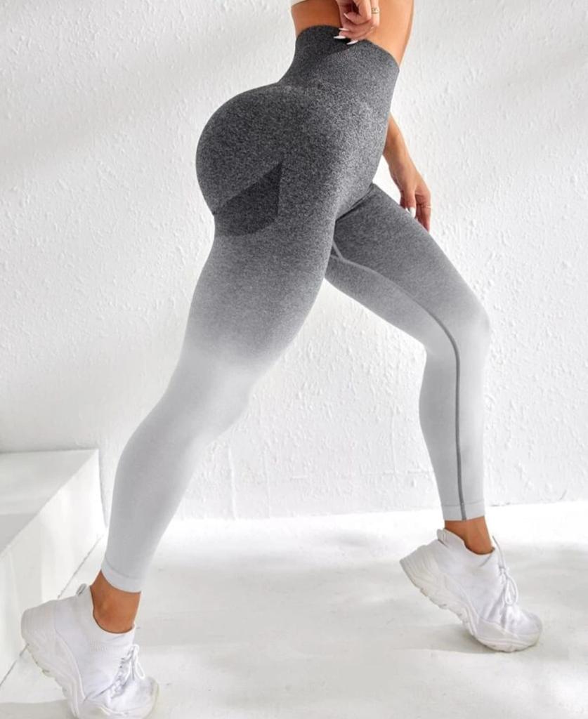 Para completar el conjunto, estas leggings vienen en un estampado degradado impresionante. El diseño llamativo comienza con un color gris en la parte superior y se desvanece gradualmente hacia un tono más claro en los tobillos, creando un aspecto visualmente cautivador que te hará destacar en el gimnasio o donde las uses.